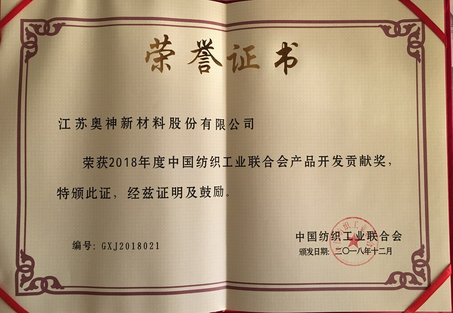 近日,在北京召開的2018年中國紡織創(chuàng)新年會上,江蘇奧神新材料股份有限公司獲得中國紡織工業(yè)聯(lián)合會頒發(fā)的“2018年度中國紡織工業(yè)聯(lián)合會產(chǎn)品開發(fā)貢獻獎”榮譽稱號。