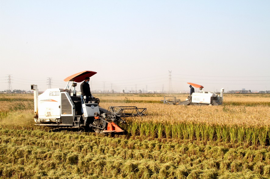 111日下午,連陰后地放睛氣溫明顯回升,鹽田稻花香,稻谷歸曬場,銷售訂單忙。在青口公司大新農場的一分場趙斯凱的條田,兩臺收割機來回穿梭,一片繁忙的景象,全公司近二萬畝水稻開始收割。