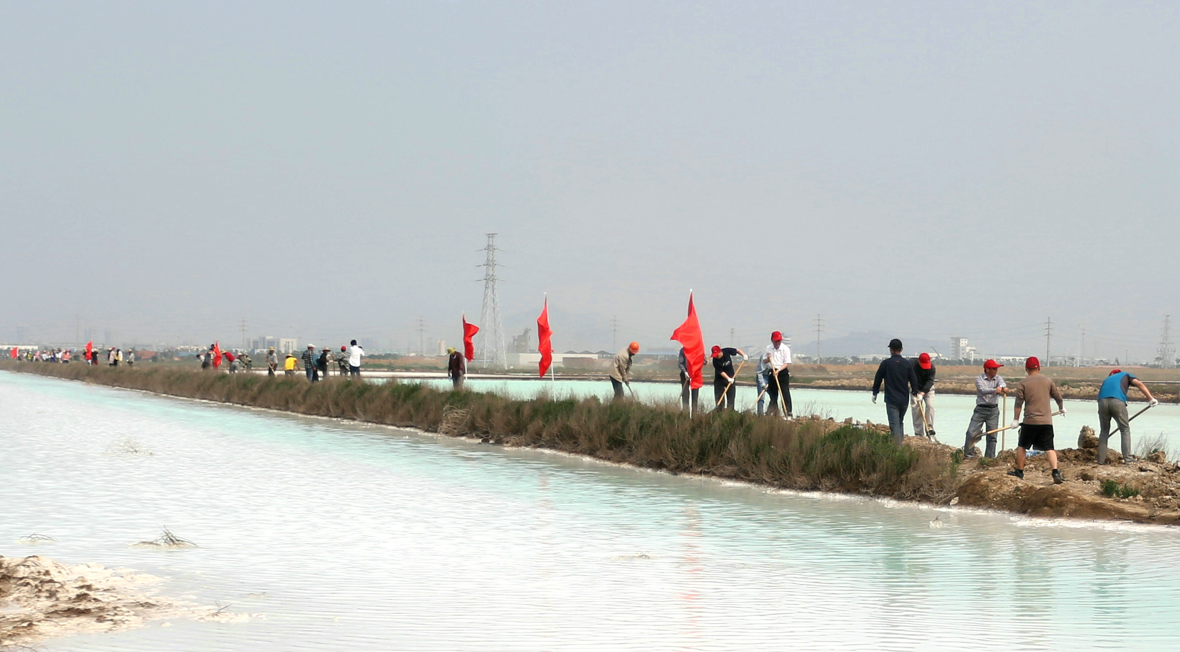 613下午,來自公司機關第一、第二黨支部及臨達公司、海州灣公司、金臺公司、海濱工區等六個黨支部的百余名黨員志愿者,自行解決交通工具和勞動工具,頂著炎炎烈日,齊聚242省道北側1公里處的臨達公司新建鈣液輸送管道現場,“一”字型排開,在近600米的溝堰上展開管道鋪設溝道回填土工程,場面蔚為壯觀。