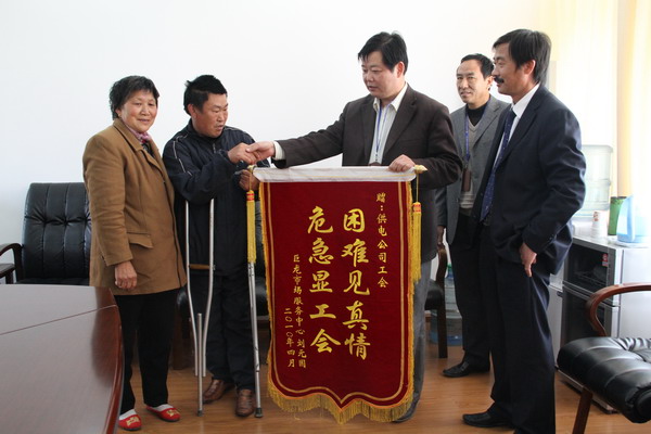4月28日,巨龍農貿市場特困職工劉元國拄著雙拐,在妻子陪伴下來公司送上錦旗,感謝干部職工的愛心捐助。去年初,下崗后在外謀生的劉元國因討要欠款發生車禍,腰部、腿部嚴重骨折,花費10萬余元,全家借錢度日。為讓劉家生活得到改善,春節前全公司發起獻愛心活動,共為劉元國募集錢款萬余元。(司宣)