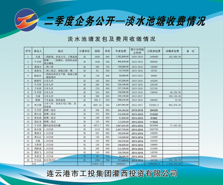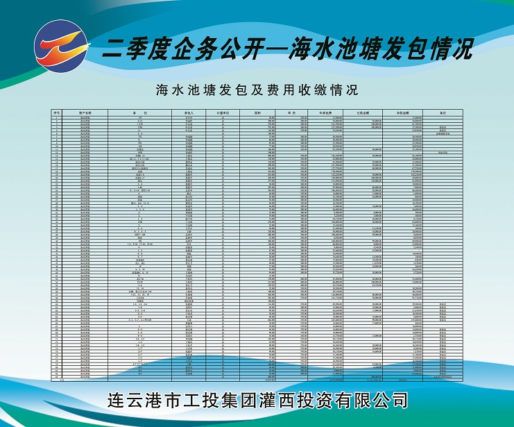 2、海水養(yǎng)殖池塘發(fā)包及費(fèi)用收繳情況。共發(fā)包海水養(yǎng)殖池塘面積13073.83畝,應(yīng)收租賃費(fèi)421.787萬(wàn)元,已收租賃費(fèi)221.39萬(wàn)元,欠收租賃費(fèi)200.397萬(wàn)元,收繳率為52%。