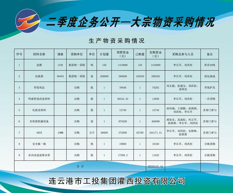 1、由集團(tuán)公司集中采購(gòu)塑料布(鹽膜)150噸(由工投集團(tuán)運(yùn)營(yíng)監(jiān)管部在總部組織招標(biāo))、包裝袋20萬(wàn)條,實(shí)購(gòu)金額計(jì)169.953萬(wàn)元。