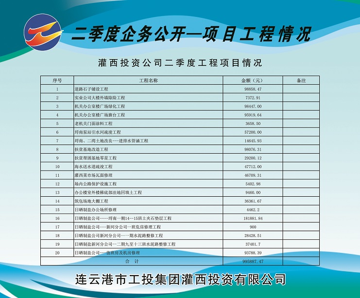 道路石子鋪設(shè)工程98858.47元;實(shí)業(yè)公司大樓外墻除險(xiǎn)工程7372.91元;機(jī)關(guān)辦公樓廣場(chǎng)綠化工程98447.00元;機(jī)關(guān)辦公室樓廣場(chǎng)旗臺(tái)工程95919.64元;老機(jī)關(guān)門(mén)面涂料工程3658.50元;埒南泵站引水河疏浚工程57200.00元;埒南、二灣 土地改良—進(jìn)排水管涵工程14645.93元;扶貧基地改造工程98076.31元;扶貧幫困基地零星工程29200.12元;海水送水道疏浚工程47712.00元;灌西菜市場(chǎng)瓦面修理46709.31元;場(chǎng)內(nèi)公路保護(hù)設(shè)施工程5402.98元;辦公樓室外樓梯底部洼地回填土工程9460元;筑包場(chǎng)地大棚工程36361.67元;日曬制鹽辦公場(chǎng)所修理4462.2元;日曬制鹽公司---埒南一期14—15班土夾石墊層工程181881.84元;日曬制鹽公司---新河分公司一班危房修理工程900元;日曬制鹽公司新河分公司—一期水泥路整修工程 28428.51元;日曬制鹽新河分公司一二期九至十三班水泥路整修工程37401.7元;日曬制鹽公司---值班房及機(jī)房修理93788.39元