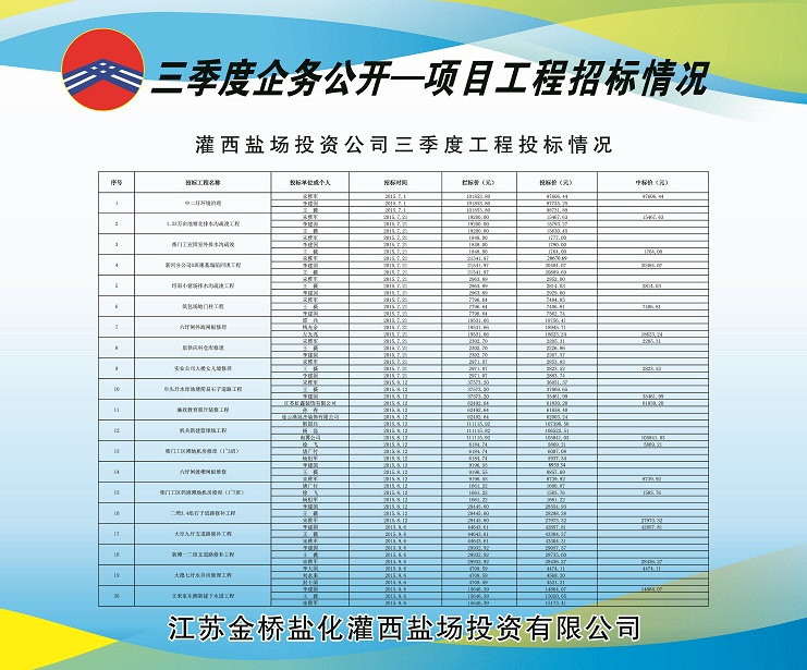 第三次是在8月12日,招標項目是:1、阜頭圩水庫池塘簡易石子道路工程,中標價為李建國35461.99元。2、廉政教育展廳裝修工程,中標價為江蘇虹鑫裝飾有限公司61830.20元。3、機關新建籃球場工程,中標價為南翼公司105841.03元。4、機柴門工區灘地機房修理(1~3班),中標價為徐飛5869.21元。5、六圩閘渡槽閘板維修,中標價為宋雅軍8739.92。6、柴門工區鈣液灘地機房修理(1~7班),中標價為徐飛1583.76元。7、二灣3.4組石子道路修補工程,中標價為宋雅軍27973.32元