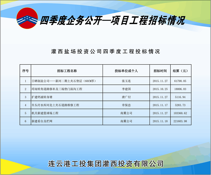 四季度灌西共開工建設(shè)6個工程項目,分4次由投資公司招標領(lǐng)導(dǎo)小組采用公開邀標形式進行了招標。