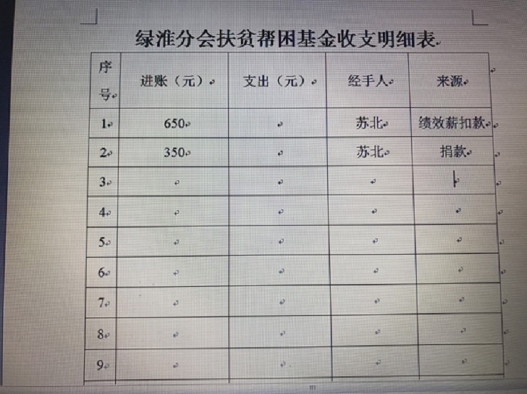 7月27日,綠淮公司出納將1000元現(xiàn)金匯入專有賬戶,標志著分會成功引入第一筆扶貧基金。