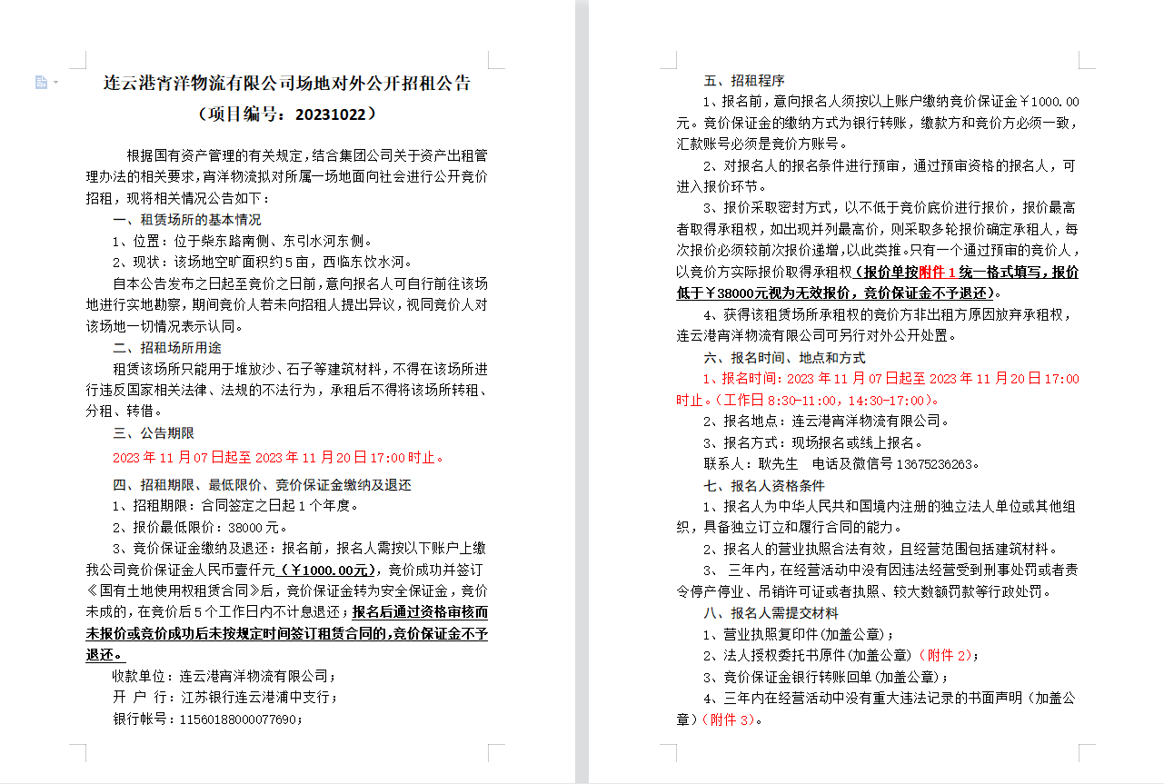 連云港宵洋物流有限公司場(chǎng)地對(duì)外公開招租公告