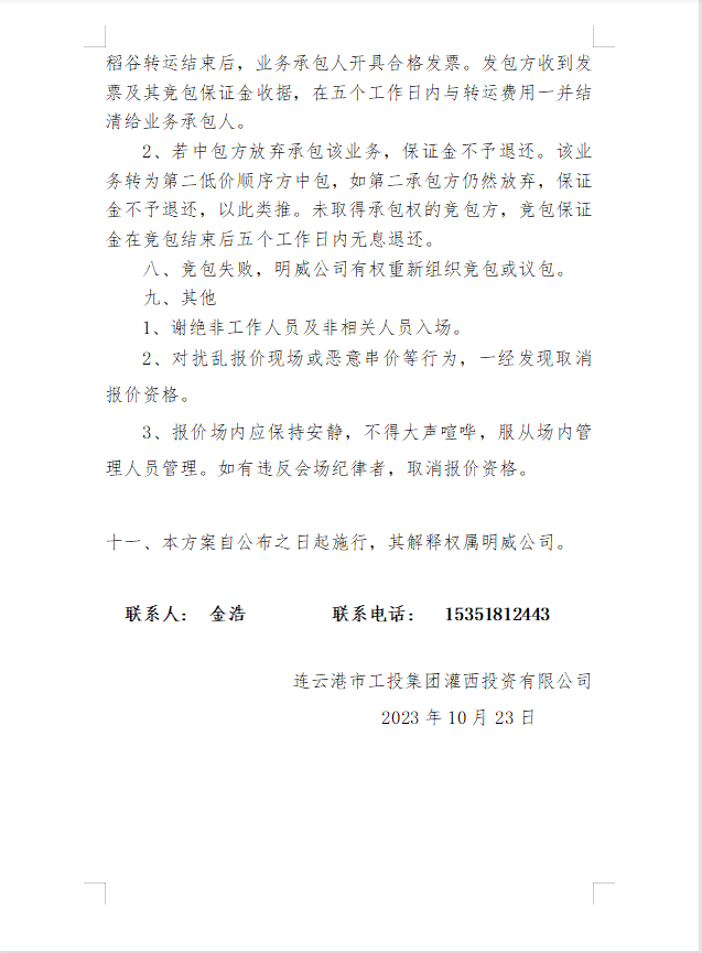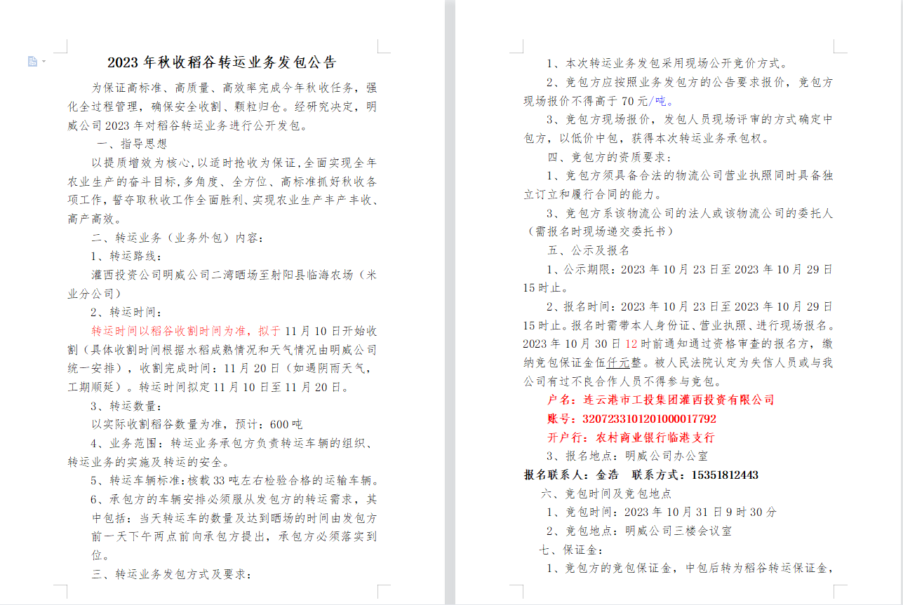 2023年秋收稻谷轉運業(yè)務發(fā)包公告
