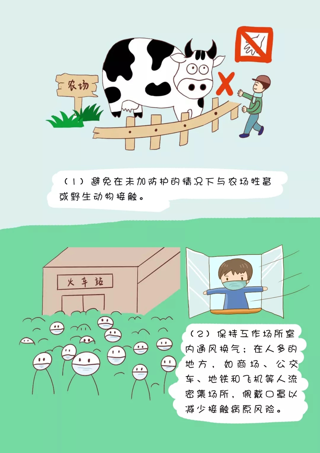 (1)避免在未加防護的情況下與農場牲畜或野生動物接觸。