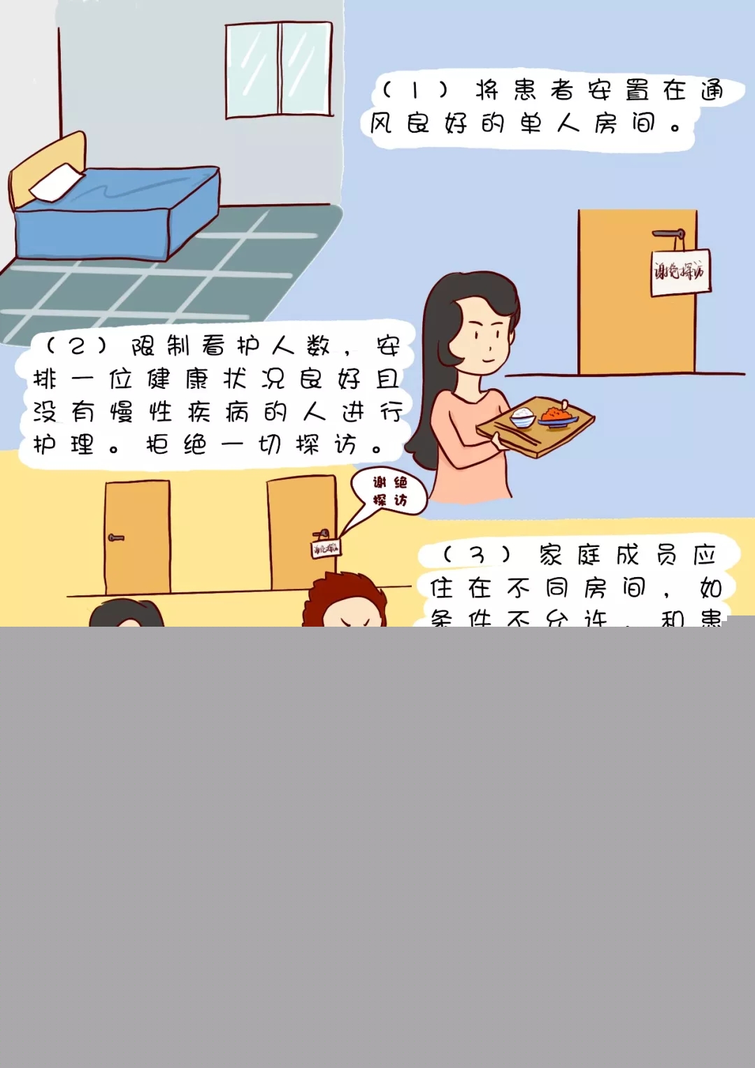 (2)限制看護人數,盡量安排一位健康狀況良好且沒有慢性疾病的人進行護理。拒絕一切探訪。