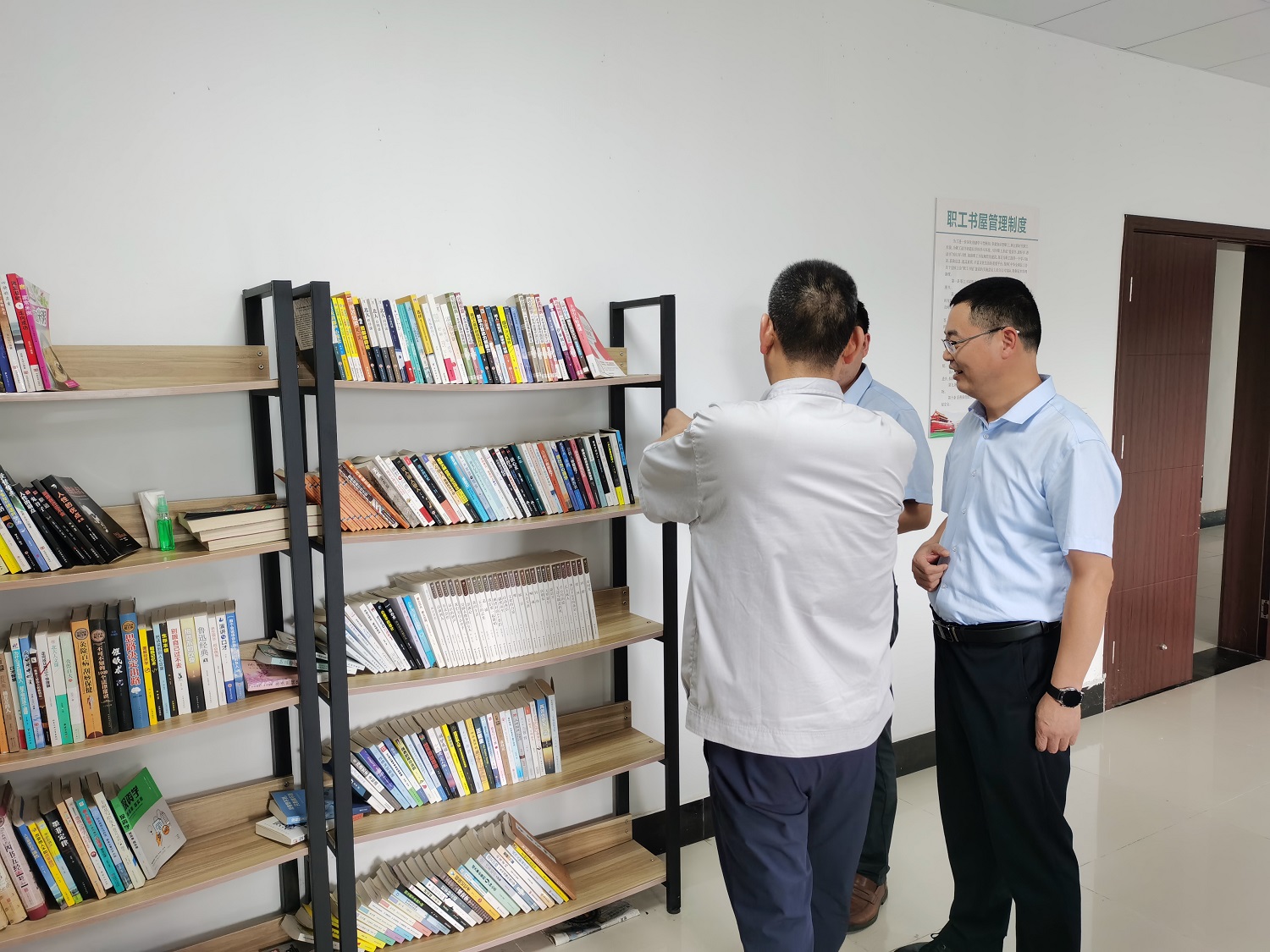在實地參觀過程中,深入了解了書屋建設、布局、管理、圖書分類及更新、登記等具體方面的內容,并就相關黨建、工會活動開展情況與神特新材料黨支部副書記、工會主席袁忠等進行了交流討論。