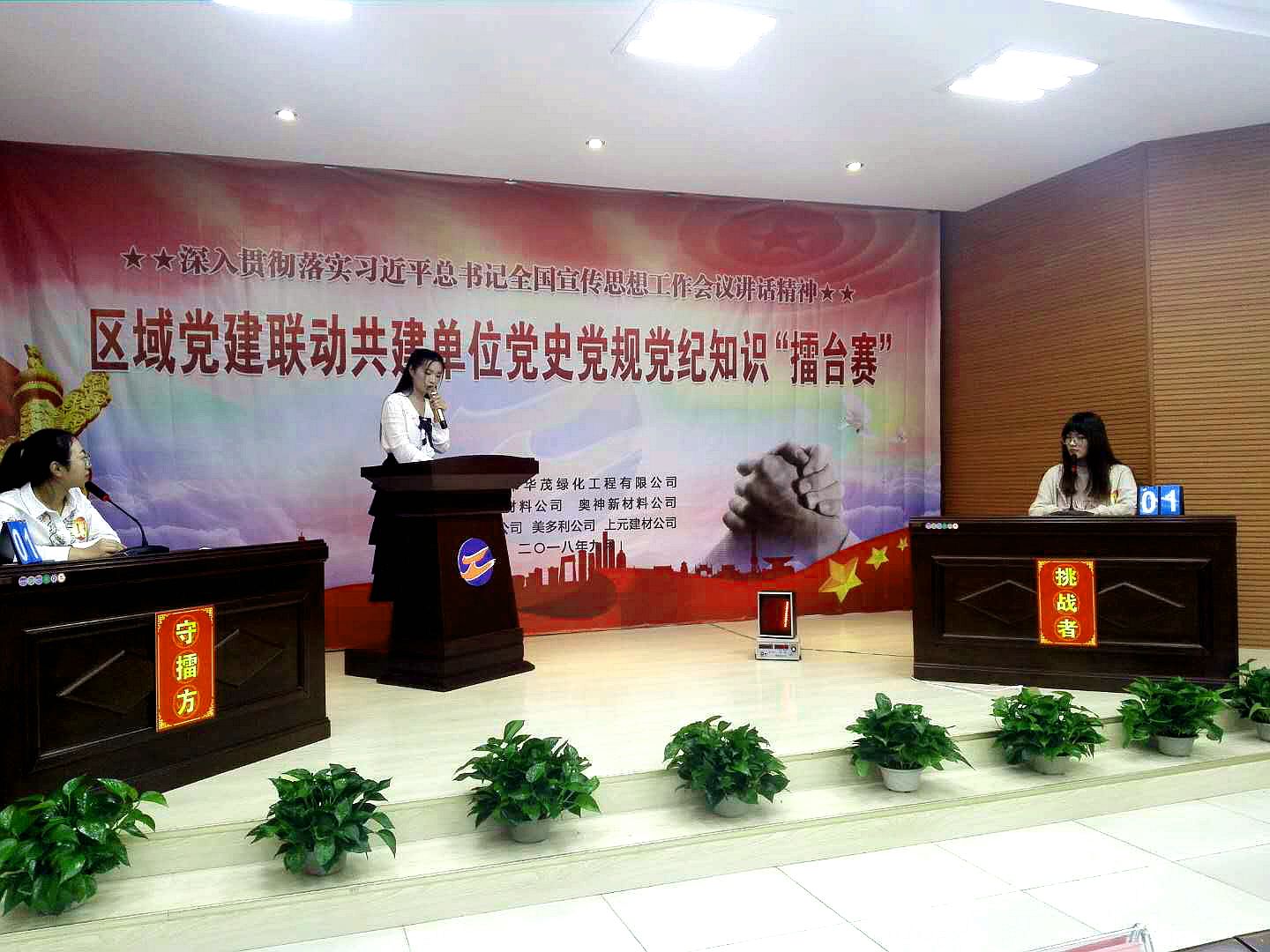 近日,華茂公司邀請神特公司、奧神新材料公司等5家區(qū)域黨建聯(lián)動(dòng)共建單位,進(jìn)行黨史黨規(guī)黨紀(jì)知識“擂臺賽”。我公司積極準(zhǔn)備,派出員工何曉璐、李筠涵參加比賽。本次活動(dòng)拉開了區(qū)域黨建聯(lián)動(dòng)共建的序幕,促進(jìn)了兄弟單位間的資源共享、融合互動(dòng),為下一步工作推進(jìn)打下了良好基礎(chǔ)。