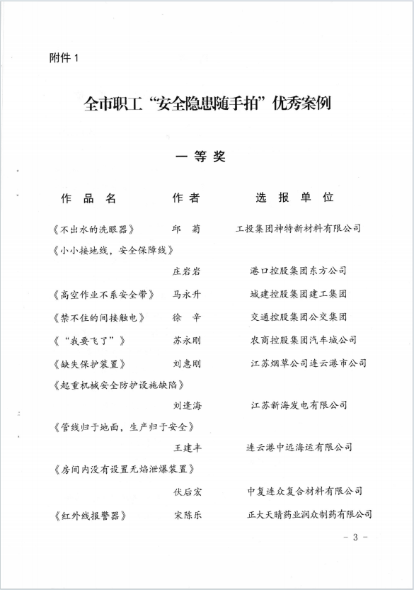 近日,市“安康杯”“安全隱患隨手拍”活動獲獎作品揭曉,公司員工邱菊參賽作品《不出水的洗眼器》獲得一等獎,陳士亮參賽作品《無用的燃氣報警器》獲得二等獎。(神特宣)