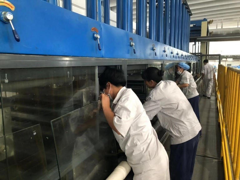 開展生產線設備清理工作。后紡員工無懼炎熱天氣,擼起袖子加油干,面臨萃取機內部空間狹小難清理難題時,身材精瘦的員工爭相進入萃取機內部進行清理作業,形成“愛企奉獻”工作氛圍。